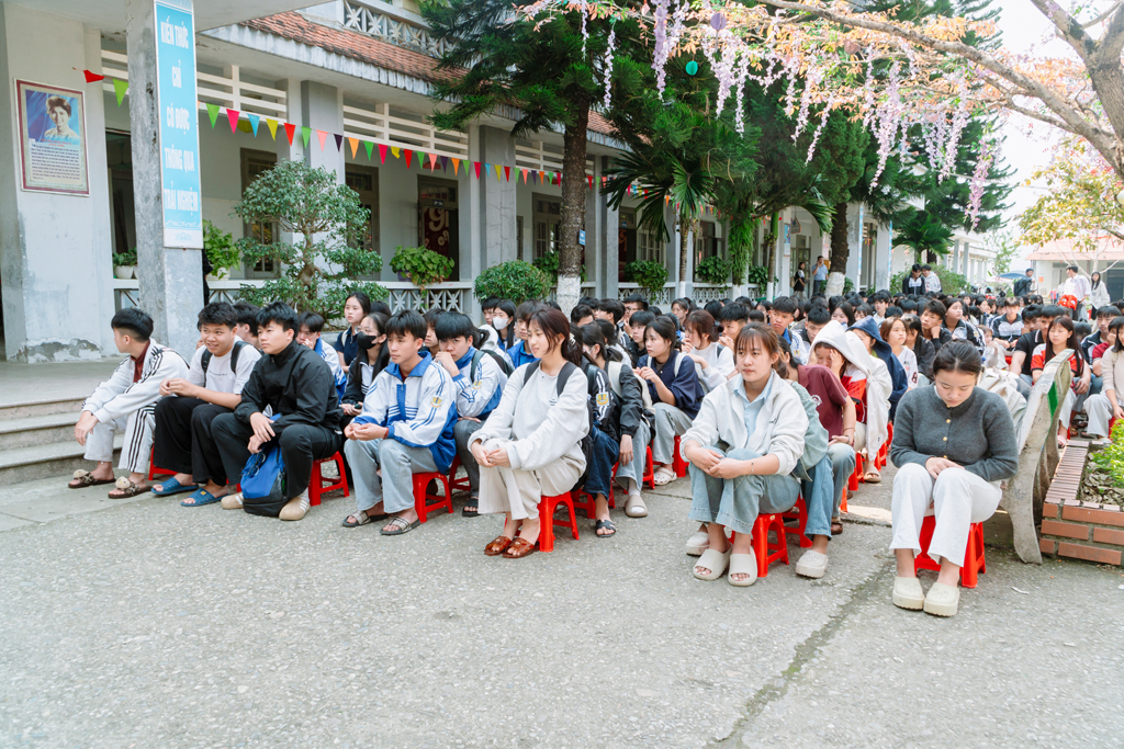 Học sinh khối 12 Trường THPT Bình Lư tham gia buổi tuyên truyền, tìm hiểu thông tin về tuyển sinh, ngành nghề đào tạo trong các trường Quân đội.