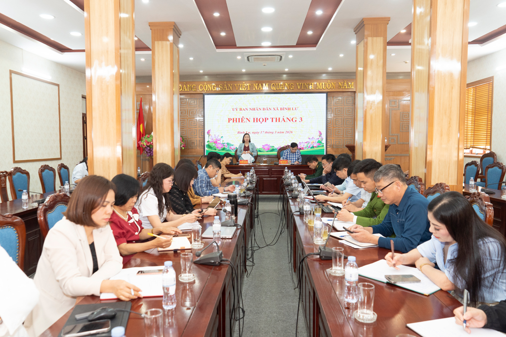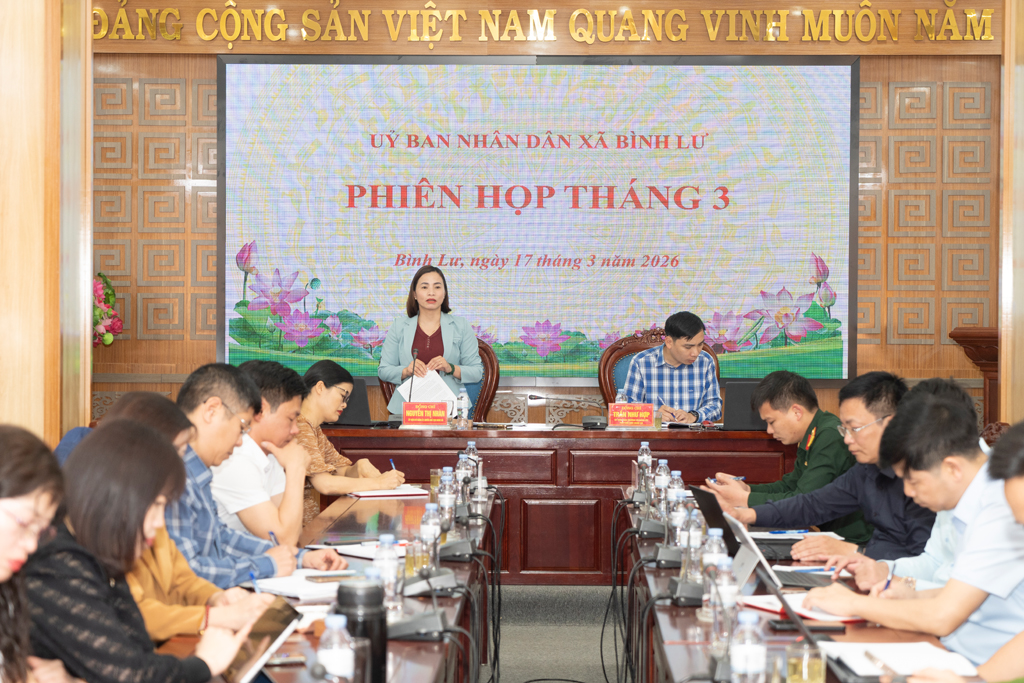 Chiều 17/3, UBND xã Bình Lư tổ chức phiên họp thường kỳ tháng 3/2026 nhằm đánh giá tình hình thực hiện nhiệm vụ quý I và triển khai nhiệm vụ trọng tâm quý II. Dự phiên họp có đồng chí Tạ Thị Dung – Phó Bí thư Thường trực Đảng ủy; đồng chí Nguyễn Thị Nhàn – Quyền Chủ tịch UBND xã; đồng chí Trần Như Hợp – Phó Chủ tịch UBND xã, cùng các thành viên UBND và đại diện các ban, ngành, đoàn thể.