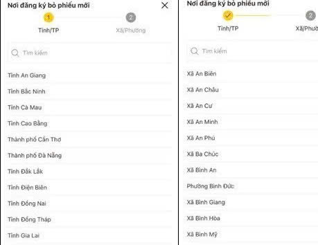 Nhấn vào "Nơi đăng ký bỏ phiếu mới", hệ thống hiển thị màn chọn địa chỉ.