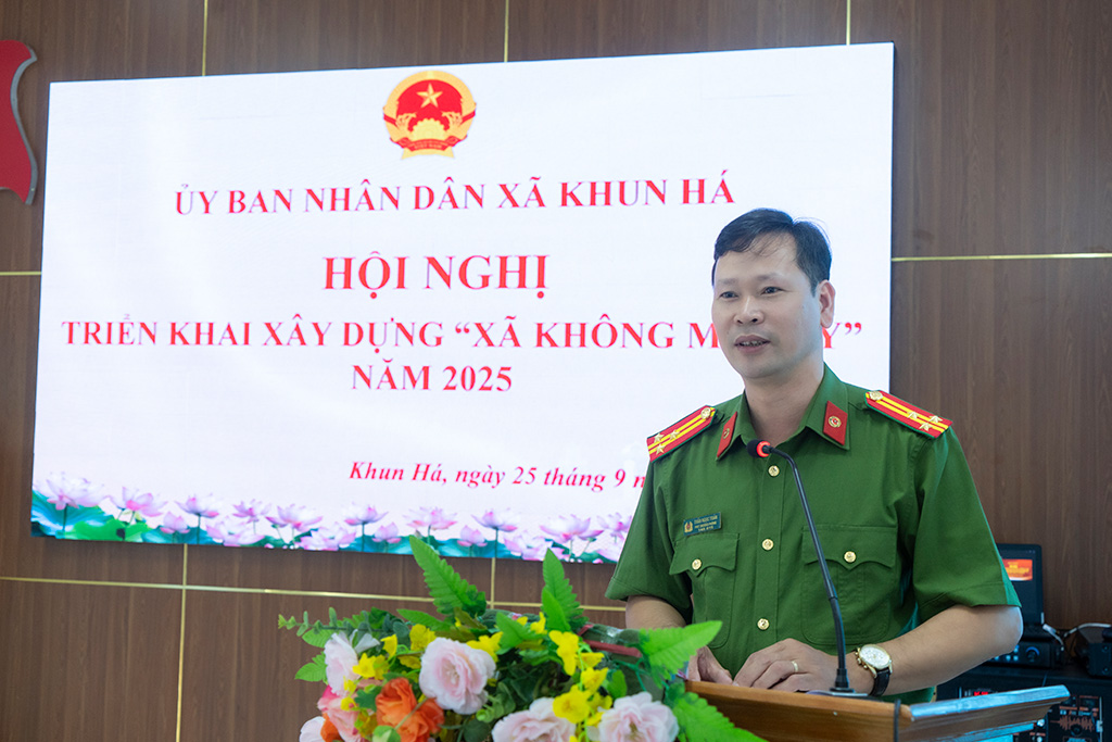 Phát biểu chỉ đạo Hội nghị, đồng chí Thượng tá Trần Ngọc Toản – Phó Trưởng phòng Cảnh sát Điều tra tội phạm về ma tuý (Công an tỉn), nhấn mạnh: Việc xây dựng “xã không ma túy” không chỉ là một nhiệm vụ trước mắt mà còn là yêu cầu chiến lược, lâu dài trong công tác giữ gìn an ninh trật tự, bảo đảm cuộc sống bình yên cho nhân dân. Theo đó, để đạt được mục tiêu xây dựng “xã Khun Há” không ma tuý trong năm 2025, đồng chí Thượng tá Trần Ngọc Toản mong muốn, lực lượng công an xã tiếp tục giữ vai trò nòng cốt, đồng thời tiếp tục phát huy cao độ vai trò của cấp ủy, chính quyền, các tổ chức đoàn thể, đặc biệt là sự đồng thuận, hưởng ứng tích cực của mỗi người dân trong công tác đấu tranh phòng, ngừa ma tuý.