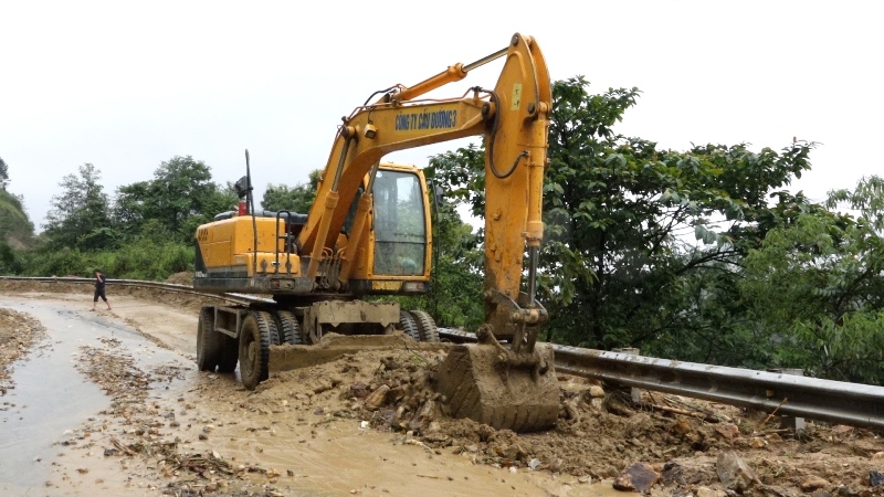 Các đơn vị thi công đang tích cực dọn dẹp đất đá, giải phóng đường trên tuyến Quốc lộ 4D