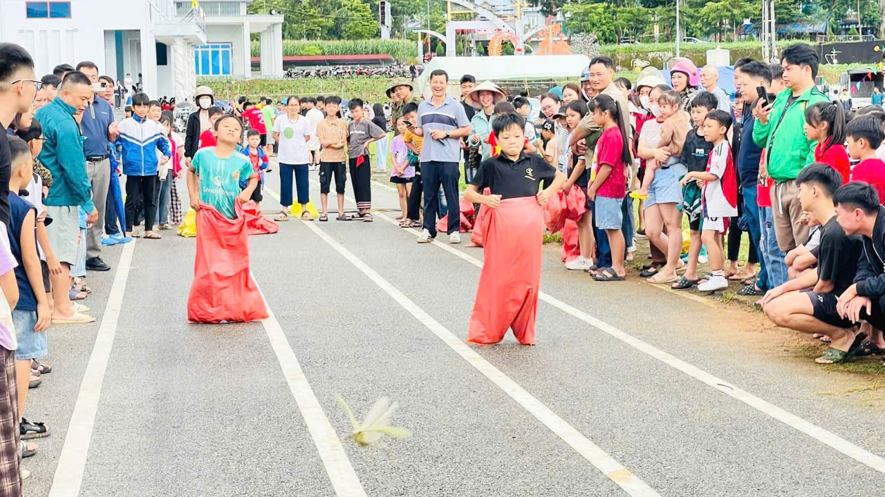 Không khí sôi nổi tại phần thi nhảy bao bố, tiếng cười và tiếng reo hò vang khắp sân hội Trung thu Bình Lư.