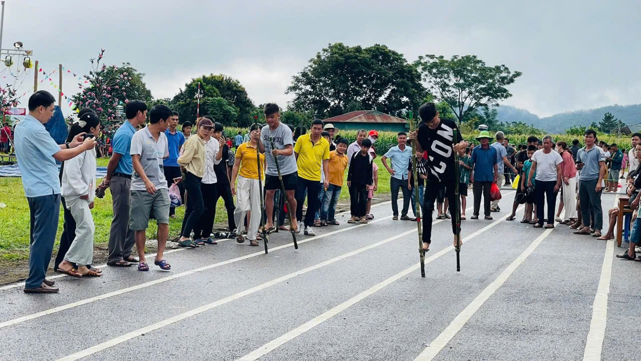 Các em thiếu nhi hào hứng tham gia phần thi đi cà kheo, thể hiện sự khéo léo và giữ thăng bằng tuyệt vời.