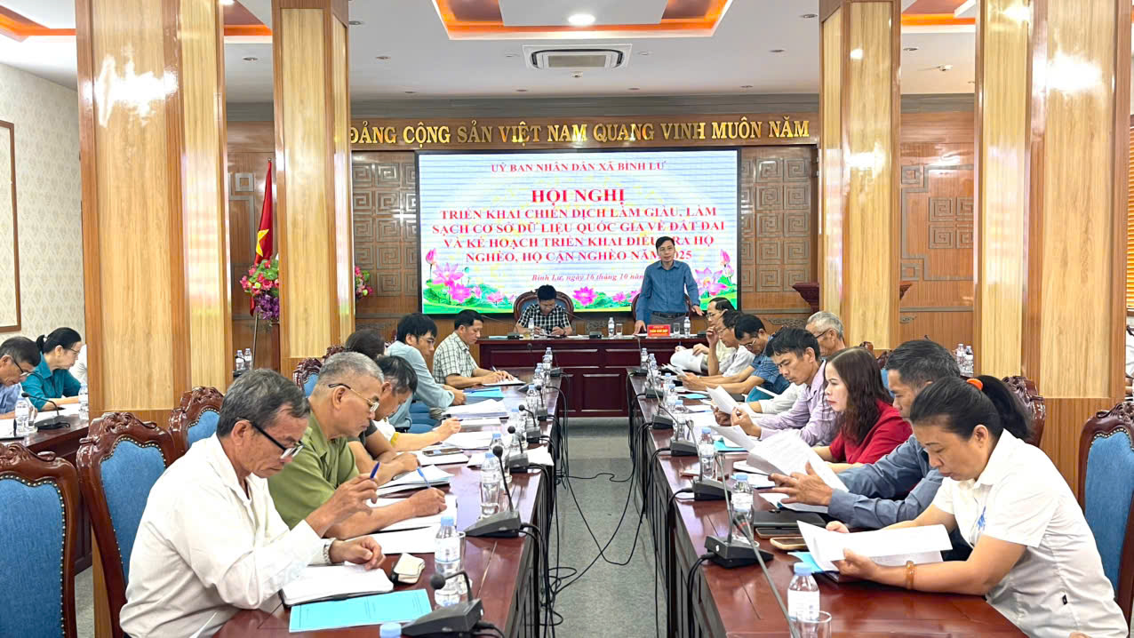 Tại hội nghị sẽ triển khai Quyết định số 504/QĐ-UBND ngày 08/10/2025 và Kế hoạch số 76/KH-UBND ngày 09/10/2025 của UBND xã Bình Lư về việc triển khai thực hiện Chiến dịch làm giàu, làm sạch cơ sở dữ liệu quốc gia về đất đai trên địa bàn xã Bình Lư.