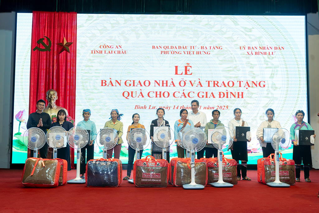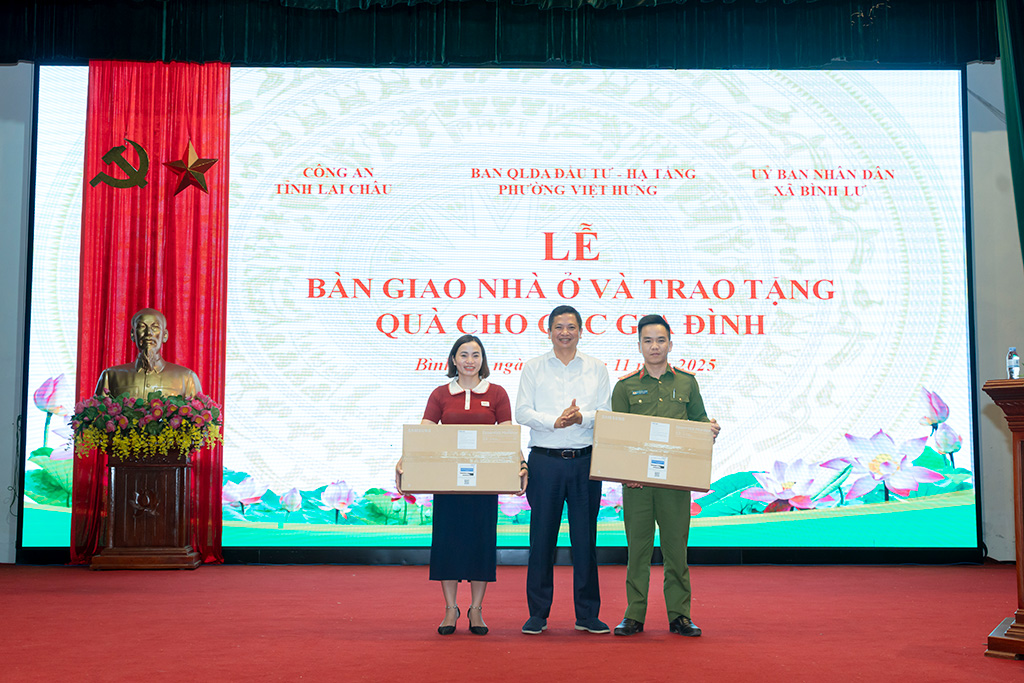 10 căn nhà mới trị giá 600 triệu đồng (mỗi căn 60 triệu đồng) đã được trao cho các hộ nghèo, cận nghèo, hộ có hoàn cảnh khó khăn đang sống trong nhà tạm, dột nát trên địa bàn xã Bình Lư. Bên cạnh đó, đoàn công tác cũng trao tặng các phần quà thiết thực gồm: quạt, nồi cơm điện, chăn ấm cho 10 hộ gia đình; 02 máy tính xách tay cho UBND và Công an xã Bình Lư. Đặc biệt, ông Vũ Trọng Thư – Giám đốc Ban Quản lý dự án đầu tư - hạ tầng phường Việt Hưng đã hỗ trợ thêm 5 triệu đồng cho gia đình chị Tao Thị Chum (bản Pa Pe).