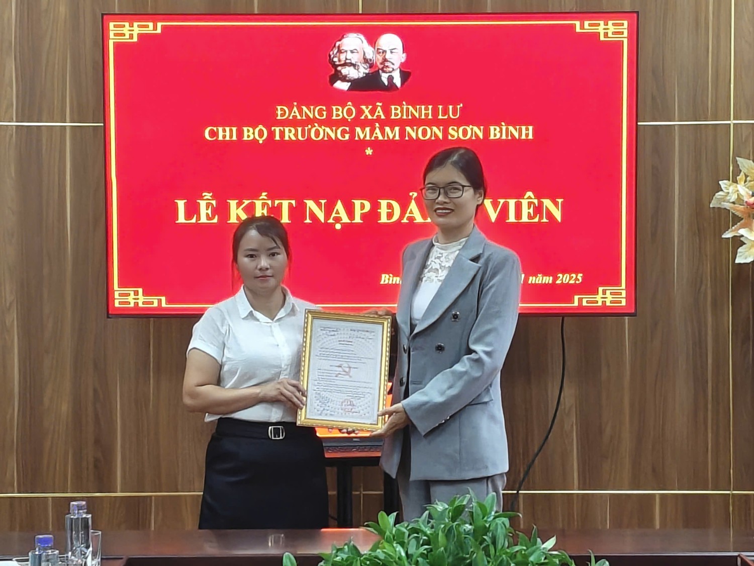 Sau một thời gian dài nỗ lực phấn đấu, rèn luyện, thử thách và nhận được sự giúp đỡ, bồi dưỡng từ Chi bộ, Ban Giám hiệu, Tổ chuyên môn nghiệp vụ cùng các tổ chức đoàn thể, 2 quần chúng ưu tú là cô giáo Vàng Thị Say và cô giáo Nguyễn Thị Tính đã vinh dự được kết nạp vào Đảng Cộng sản Việt Nam theo Quyết định của Đảng ủy xã Bình Lư. Tại buổi Lễ, Bí thư Chi bộ Trường Mầm non Sơn Bình đã công bố Quyết định kết nạp, đồng thời thông qua quyền hạn, nghĩa vụ của Đảng viên và giao nhiệm vụ cho các Đảng viên theo dõi, giúp đỡ 2 đảng viên mới trong thời gian dự bị.