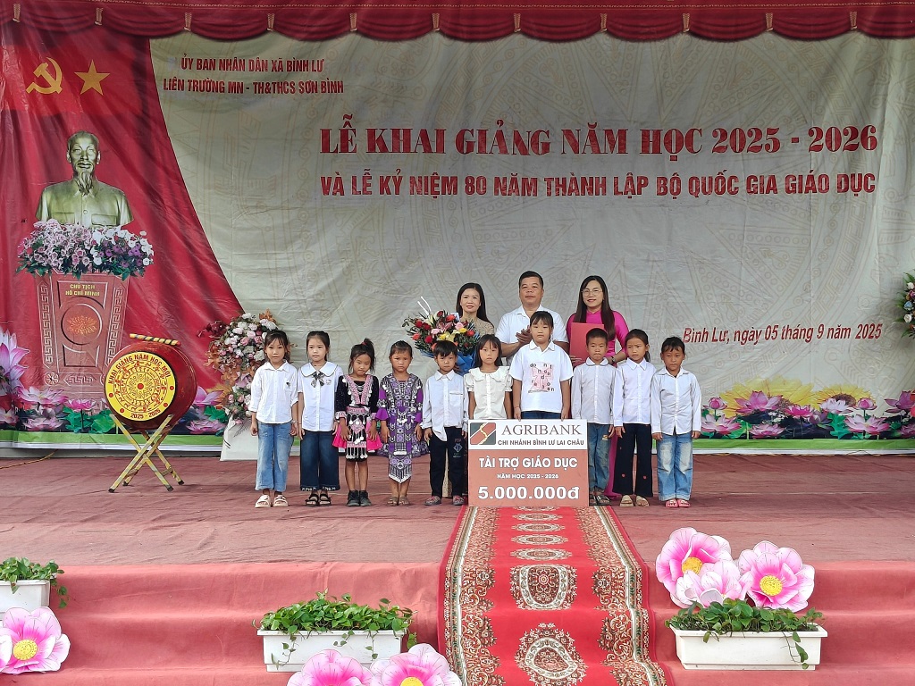Đại diện lãnh đạo Chi nhánh Ngân hàng Agribank Tam Đường trao quỹ an sinh giáo dục cho trường Tiểu học & THCS Sơn Bình.