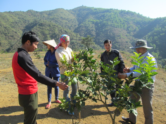 Cán bộ bản chăn nuôi hướng dẫn người dân kỹ thuật chăm sóc cây cam