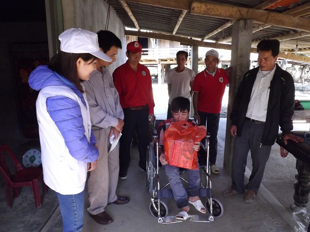 Hội chữ thập đỏ huyện và các cá nhân có lòng hảo tâm trao xe lăn cho Lò Văn Ín.