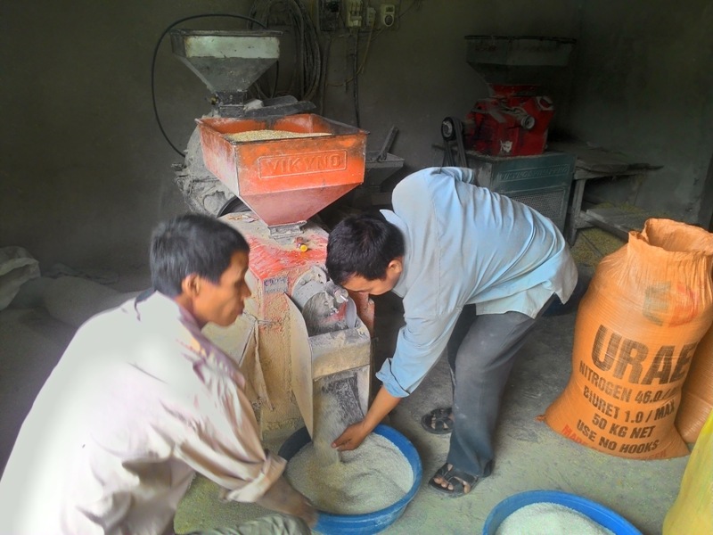 Anh Lò Văn Hiền đang sát thóc phục vụ bà con nhân dân trong bản