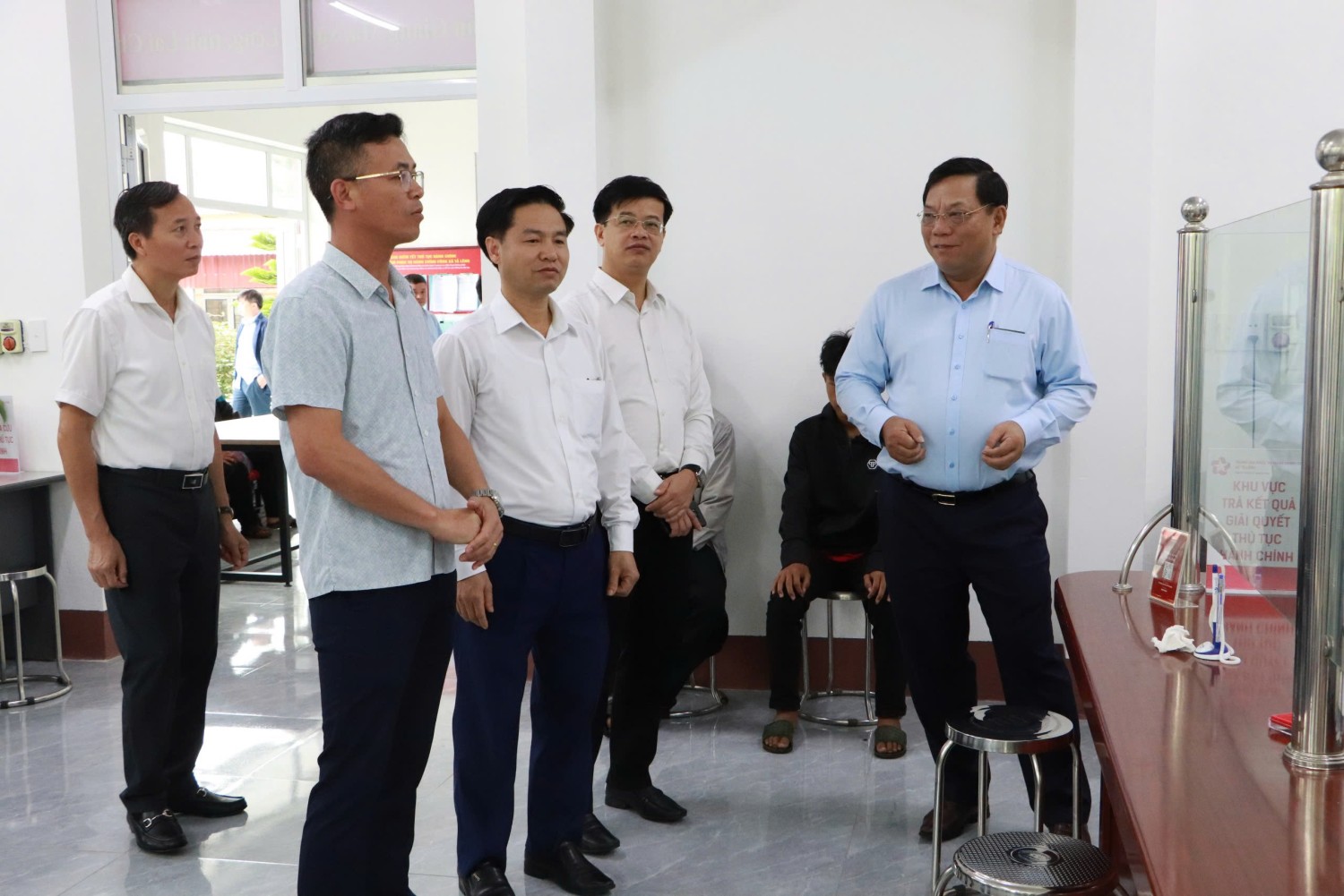Đồng chí Nguyễn Hải Trung - Thứ trưởng Bộ Dân tộc và Tôn giáo (Người đứng thứ nhất từ phải sang) thăm, động viên cán bộ, công chức Trung tâm Phục vụ Hành chính công xã Tả Lèng