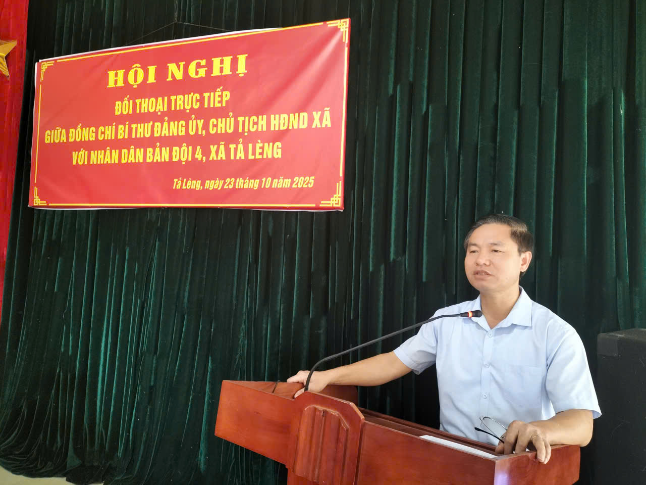 Sáng ngày 23/10, Đảng ủy xã Tả Lèng tổ chức hội nghị đối thoại trực tiếp giữa đồng chí Hoàng Văn Trinh – Bí thư Đảng ủy, Chủ tịch HĐND xã với Nhân dân bản Đội 4. Tham dự hội nghị còn có đại diện Thường trực HĐND, lãnh đạo UBND, các ban, ngành, đoàn thể xã; Công an, Quân sự, Trạm Y tế; đại diện Hợp tác xã Chăn nuôi và Trồng trọt Hồ Thầu cùng đông đảo cán bộ, đảng viên, người có uy tín và bà con Nhân dân bản Đội 4.