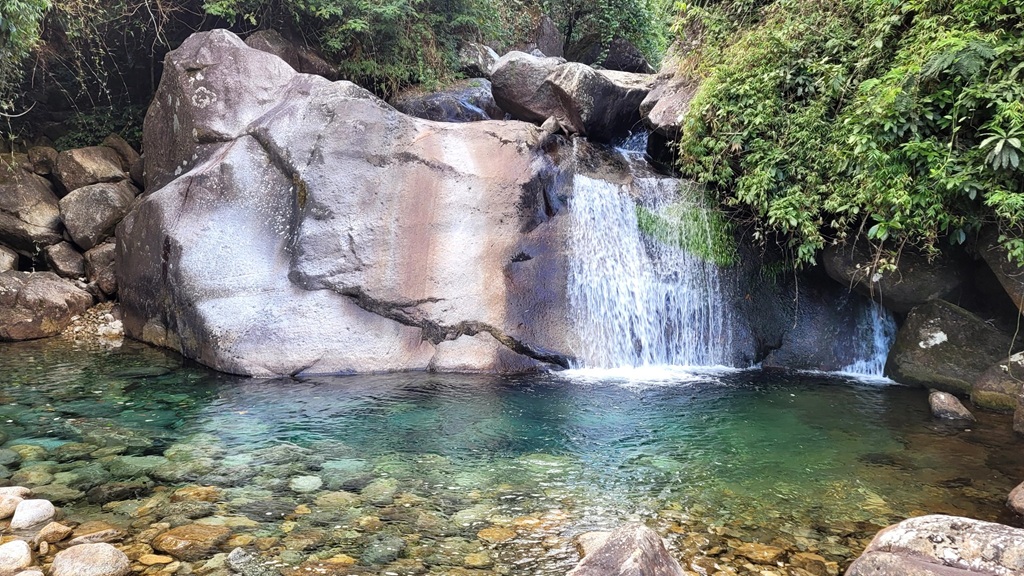 Thác nước trong xanh, tuyệt đẹp trên lối đi.