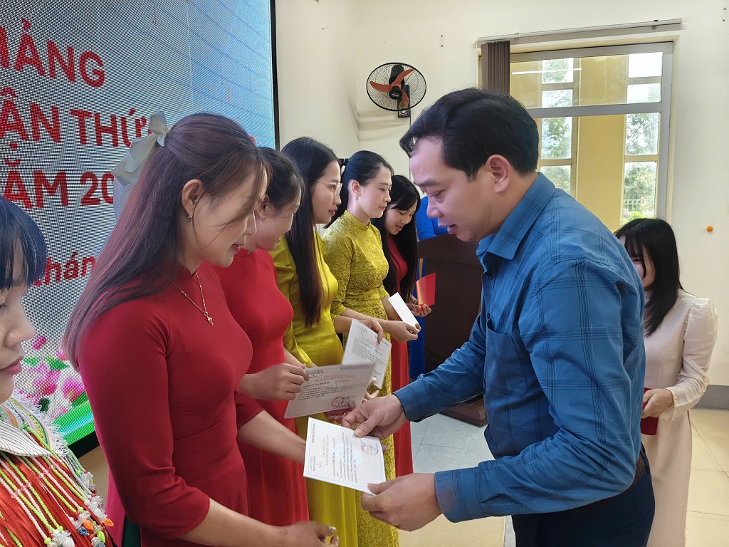 Giám đốc Trung tâm Chính trị Bình Lư khen thưởng cho các học viên có thành tích học tập và hoạt động xuất sắc trong quá trình học.