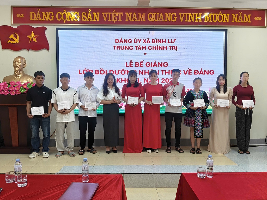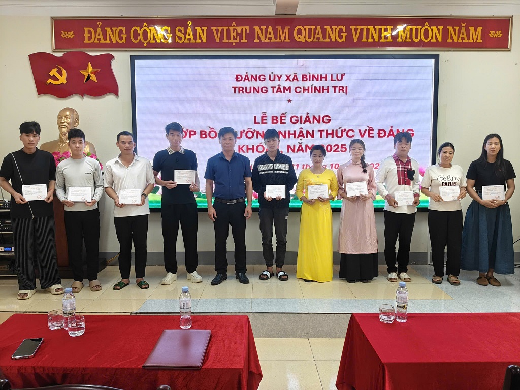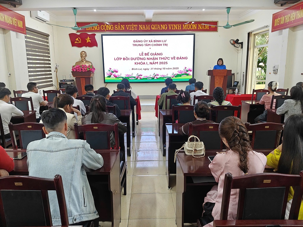 Chiều ngày 31/10/2025, tại Trung tâm Chính trị Bình Lư đã diễn ra Lễ bế giảng Lớp bồi dưỡng nhận thức về Đảng khóa I năm 2025, đánh dấu sự hoàn thành chặng đường học tập quan trọng của 41 học viên ưu tú. Tham dự buổi lễ có đại diện lãnh đạo các ban xây dựng Đảng xã Bình Lư, lãnh đạo Trung tâm Chính trị cùng toàn thể 41 học viên đến từ các chi, Đảng bộ của 4 xã: Bình Lư, Bản Bo, Khun Há và Tả Lèng.