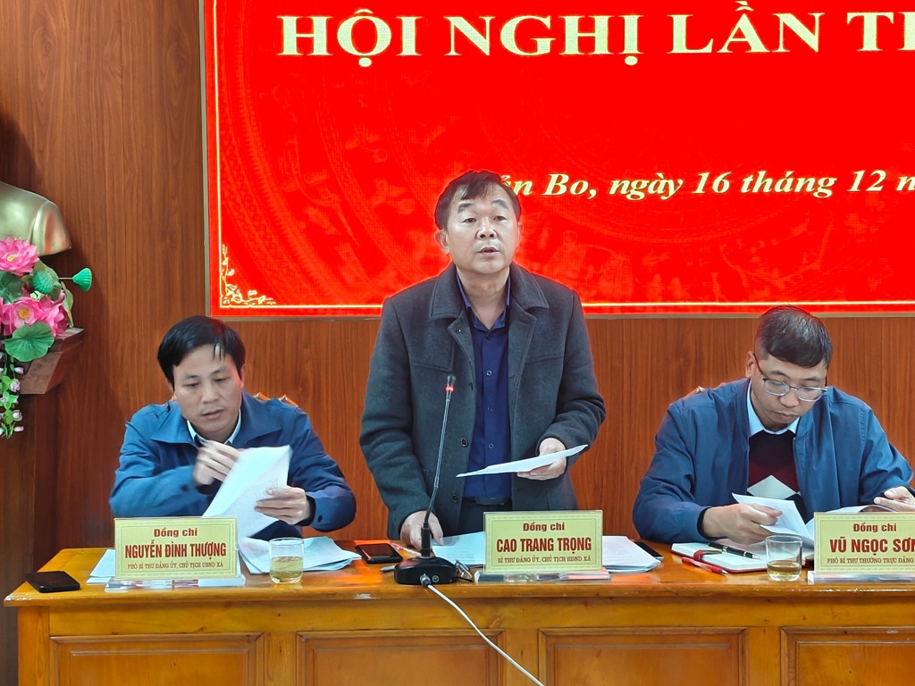 Phát biểu kết luận Hội nghị, đồng chí Cao Trang Trọng - Bí thư Đảng ủy xã khẳng định: Sau gần 6 tháng triển khai mô hình chính quyền địa phương 2 cấp, xã Bản Bo đã nhanh chóng ổn định tổ chức, giúp cán bộ, công chức yên tâm công tác; hoàn thành Đại hội các tổ chức Hội và tập trung xử lý hiệu quả các việc khó, các chương trình mục tiêu. Triển khai nhiệm vụ năm 2026, Bí thư Đảng ủy xã đề nghị các đ/c trong BCH và các tổ chức Đảng cần tập trung rà soát, sắp xếp đội ngũ cán bộ theo đúng vị trí việc làm, đảm bảo "rõ người, rõ việc"; đồng thời kiểm tra, tu sửa cơ sở vật chất để đảm bảo hoạt động hiệu quả. Đối với nhiệm vụ trọng tâm thời gian tới, đ/c Cao Trang Trọng yêu cầu các đ/c trong Ban chấp hành, Đảng ủy, chính quyền xã cần tập chung thực hiện tốt cuộc bầu cử Đại biểu Quốc hội và HĐND các cấp. Các chi bộ thôn bản cần đẩy mạnh công tác tuyên truyền để nhân dân nắm rõ quyền lợi và trách nhiệm công dân. Đối với phát triển kinh tế, cần thực hiện quyết liệt Nghị quyết về cây chè thông qua việc thành lập tổ hợp tác, tiến tới số hóa vùng chè; đẩy mạnh chuyển đổi cơ cấu cây trồng vật nuôi và phát triển du lịch gắn với bản sắc văn hóa thông qua kết nối với các đơn vị lữ hành. Bí thư Đảng ủy xã cũng lưu ý các cơ quan chuyên môn cần tăng cường giám sát, đôn đốc thực hiện các chương trình mục tiêu; chú trọng công tác phát triển Đảng và nâng cao chất lượng sinh hoạt chi bộ cơ sở; quyết tâm xây dựng Bản Bo trở thành xã không ma túy, góp phần thực hiện thắng lợi Nghị quyết Đại hội Đảng bộ xã đã đề ra.