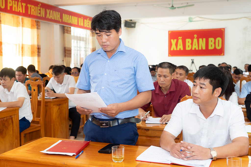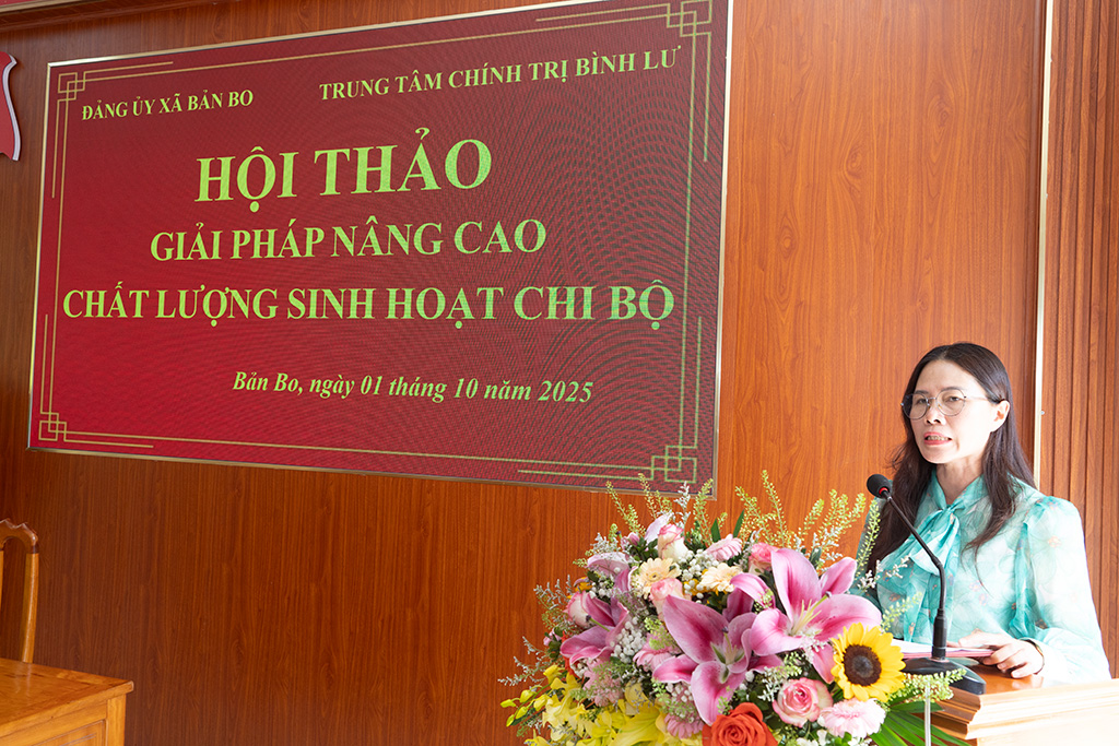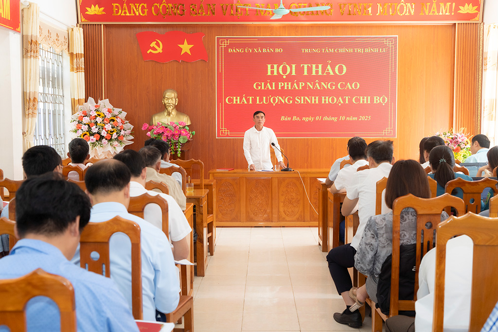 Chiều ngày 01/10/2025, tại Hội trường xã Bản Bo, Ban Thường vụ Đảng ủy xã Bản Bo tổ chức Hội thảo “Giải pháp nâng cao chất lượng sinh hoạt chi bộ”. Dự hội thảo có đồng chí Vũ Ngọc Sơn – Phó Bí thư Thường trực Đảng ủy xã Bản Bo; lãnh đạo Trung tâm Chính trị Bình Lư; lãnh đạo các cơ quan tham mưu, giúp việc Đảng ủy xã; Ủy ban MTTQ và các tổ chức chính trị - xã hội xã; bí thư, phó bí thư, chi ủy viên các chi bộ trực thuộc.