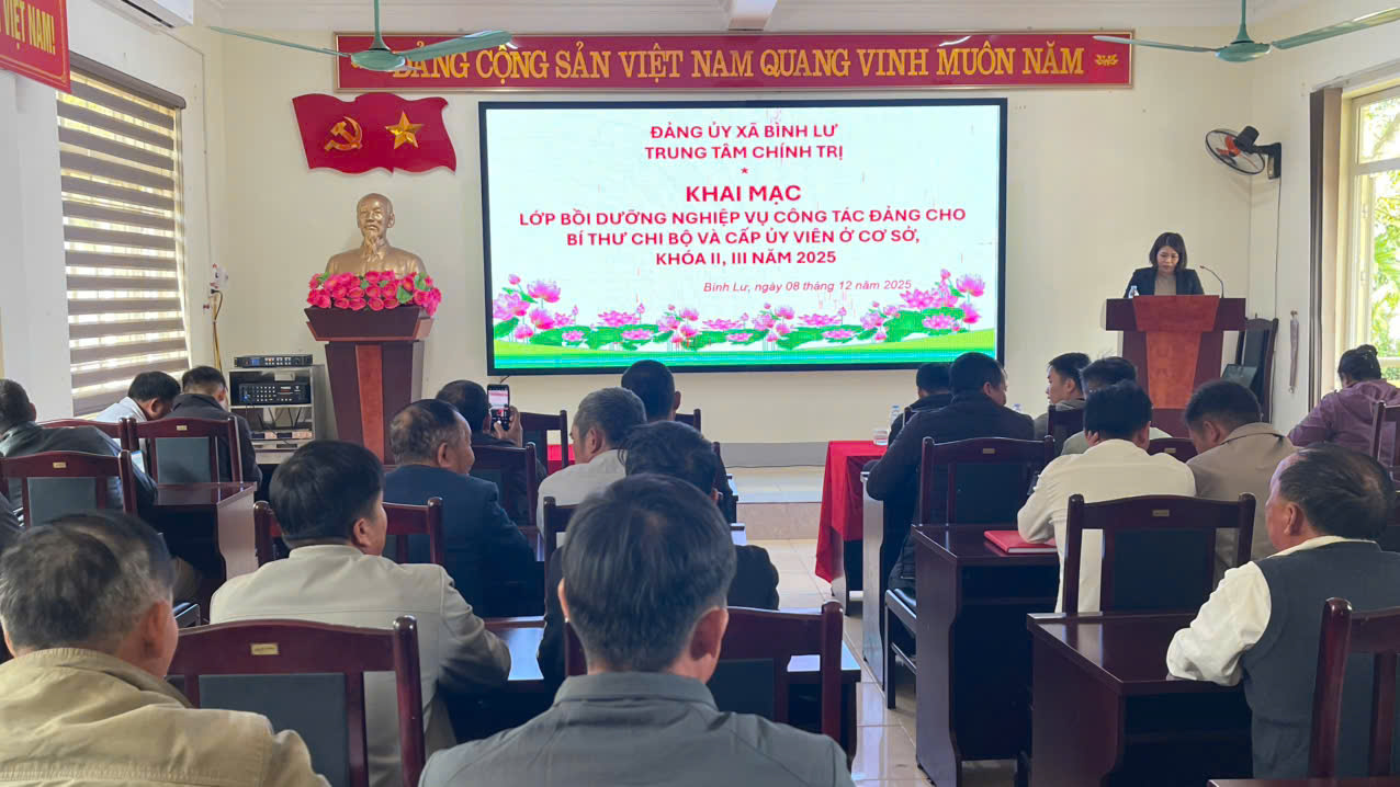 Chiều ngày 8/12, Trung tâm Chính trị Bình Lư tổ chức khai giảng Lớp bồi dưỡng nghiệp vụ công tác Đảng dành cho đội ngũ Bí thư chi bộ và cấp ủy viên cơ sở khóa II, III năm 2025. Tham gia lớp học có 101 học viên là cán bộ, đảng viên đang trực tiếp thực hiện nhiệm vụ tại các chi bộ các xã Bình Lư, Bản Bo, Khun Há và Tả Lèng