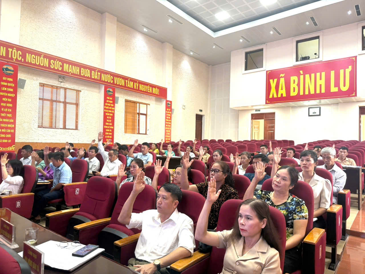 Các đại biểu HĐND xã Bình Lư biểu quyết thông qua các nghị quyết quan trọng tại Kỳ họp thứ tư (chuyên đề) HĐND xã khóa XXI, nhiệm kỳ 2021-2026.