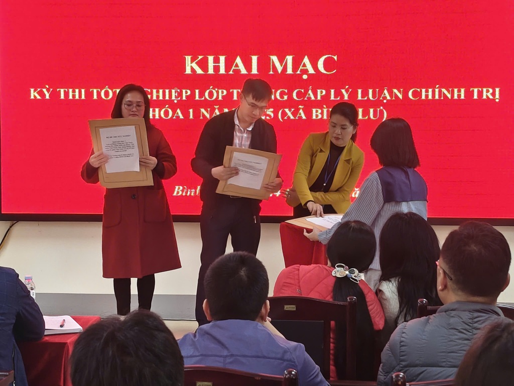 Tại buổi lễ, đại diện Hội đồng thi Trường Chính trị tỉnh đã công bố các quyết định thành lập Hội đồng thi, Ban Coi thi và danh sách các học viên đủ điều kiện dự thi. Sau 9 tháng học tập và rèn luyện nghiêm túc, 46 học viên của lớp Trung cấp lý luận chính trị khóa I năm 2025 Bình Lư đã hoàn thành toàn bộ chương trình đào tạo. Dựa trên kết quả học tập, Hội đồng xét tốt nghiệp đã phê duyệt 9 học viên đủ điều kiện viết khóa luận tốt nghiệp và 37 học viên tham dự kỳ thi tốt nghiệp.